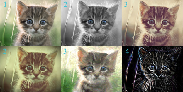 This category includes various artistic filters and effects, such as color effects (sepia, black&white as well as filters that leave a selected color in an image and turn the rest of the image into B&W); vintage and old photo filters; different art and painting effects (chalk&charcoal, sketch, oil painting, Van Gogh effects) and other fancy filters like neon, fire, matrix, underwater, mosaic and others.