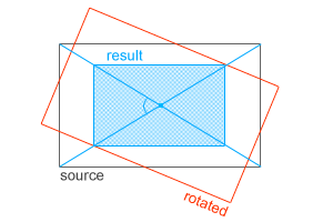 Rotation of the source image by the specified angle. Formatted as: rotation="x.xx" where x.xx is the angle of rotation (a floating point number in the interval [0°..360°]). A source image is rotated clockwise around its centre point. The resulting image is cropped to maximum size without showing the background. The aspect ratio of a source image is preserved (see the picture below, the resulting image is colored blue).