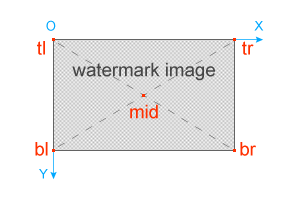To calculate these points, put the upper left corner of the source image at the origin of an XY-coordinate system. The coordinates of the points (x.xx) are defined with a value from 0.00 to 1.00 and are measured in the parts of corresponding resulting image side size. In case only one point is specified, the size of the watermark image does not change. If two points are specified, the watermark image is resized according to a specified rectangle. For example, you can set only the upper left (tl) and lower right (br) points. Example of watermark tag usage: <watermark>url=http://ope-api.pho.to/pics/sample_watermark.png; tl=(0.8, 0.85);br=(0.9, 0.95)</watermark> |